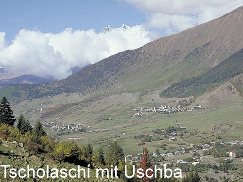 auf die Hauptberge des Zentalkaukasus. Das Dorf Uschguli, in dem Sie übernachten,