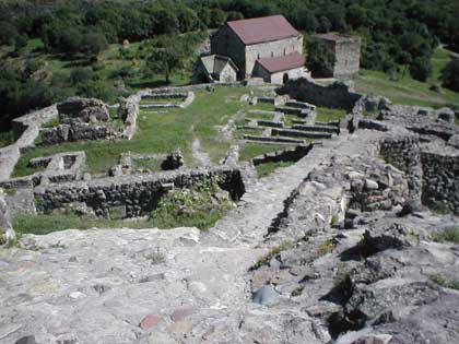 Die mittelalterliche Burganlage wird in ihren ältesten Resten auf das 5. - 7. Jahrhundert datiert. Sie hat eine Fläche von 13 Hektar, das gesamte Stadtareal, auf dem auch die berühmten Urmenschen-Schädel mit einem Alter von rund 1,7 Millionen Jahren gefunden wurden, war rund 30 Hektar gross. Dmanissi liegt gut geschützt auf einem Plateau über dem Zusammenfluss der Flüsse Maschawera und Pinesauri direkt an der wichtigen Durchgangsstrecke nach Armenien. Durch Zolleinkünfte und Handel soll Dmanissi durchaus wohlhabend gewesen sein, was sich auch durch die Mächtigkeit seiner Festungsanlagen und den grosszügigen Palast mit einem aufwendig beheizten Badehaus und einem recht grossen Weinkeller dokumentiert wird. Um die Wende des 10.-11. Jh übernehmen armenische Könige die Herrschaft im Gebiet Bolnissi-Dmanissi, aus der Zeit stammt die zweite historische Bezeichnung des Gebiets: Somchiti. Später war Dmanissi Sitz arabischer Emire, erst 1123 gelingt es König Davit, dem Erbauer, die von Feinden stark beschädigte Stadt wieder zu erobern. Die bis heute gut erhaltene Festungsmauer stammt überwiegend aus dem 12. Jh. Als Stadt funktionierte Dmanissi bis zum 15. Jh., Plünderungen von Tamerlan bedeuteten ihr Ende. Danach spielte sie nur noch eine Rolle als Festung. Die gesamte Festungsanlage